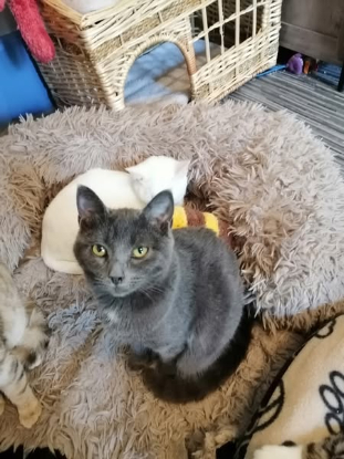 C'est un des 4 chatons de Mazenay récupéré en catastrophe alors qu'il était signalé s'amusant sur la route, sa naissance est estimée au 1er mai
