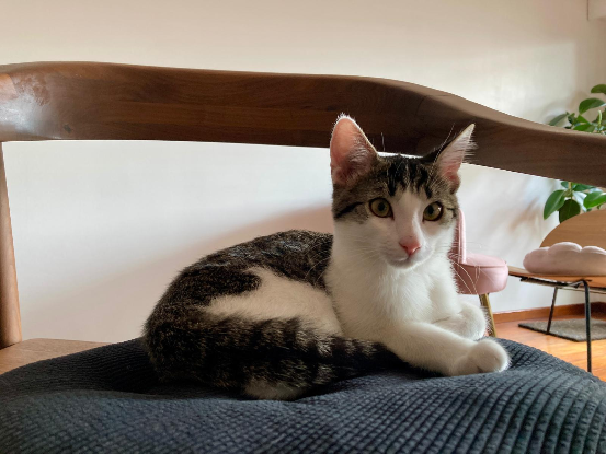 Mais c’est aussi une véritable petite tornade ! Elle grimpe un peu partout et elle chasse tout ce qu’elle trouve. Elle est infatigable et je subis un peu parfois ses assauts… Par exemple, Madame me vire régulièrement des fauteuils, Je me défends mais elle est très forte !