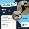 Voici le beau Mélo, qui ressemble comme une goutte d’eau à son frère Méli ! Mélo est un chat très attachant, qui aime jouer avec tout ce qu’il croise : petite souris, ficelle, balle en papier. Mélo aime les jouets simples, mais encore mieux quand c’est son humain qui joue avec lui ! Le loulou est aussi plutôt gourmand, et sait très bien faire ses yeux doux pour avoir une petite friandise en plus. Mélo est donc plein de surprise, et mérite d’avoir une famille aussi douce et gentille que lui.