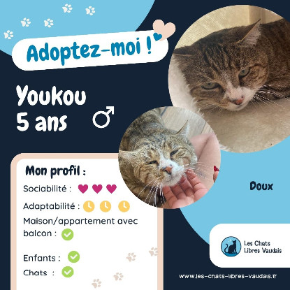 Ne vous fiez pas au regard tristounet de Youkou ! Ce gros charmeur est un chat extraordinaire, débordant d’amour et de reconnaissance. Du haut de ses 5 années, Youkou est un chat calme, qui sait ce qu’il veut : des câlins sur les jambes de ses humains, des friandises, et surtout des plaids chauds. Youkou aime le confort et la tendresse. C’est un chat facile à vivre, qui apporte de l’amour et de la joie à ses humains. Nous ne pouvons que vous encourager à lui offrir sa chance, tant il est génial !