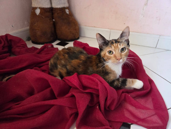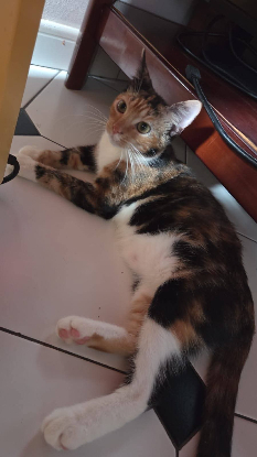 Avec sa fratrie, elle a été retrouvée toute petite dans un restaurant en Martinique, avec leur maman peureuse, tous dans un état très difficile, atteints de teigne et de coryza. Grâce aux soins et à l’amour reçus, elle est aujourd’hui en pleine forme, même si elle garde une petite séquelle : un léger ronflement lorsqu’elle respire, dû à son ancien coryza, sans aucune incidence sur sa santé .