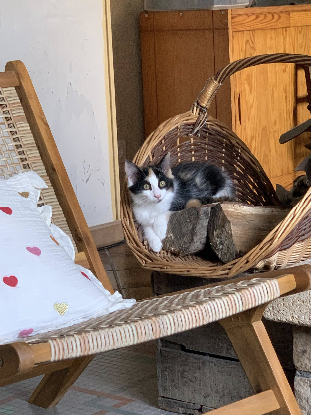 Je suis une machine à bêtise et de dynamisme : vous me verrez courir, sauter, faire des pirouettes. J’ai mes petites habitudes : j’observe l’extérieur l’après-midi lors de la sieste, je fais une petite pause litière le soir (21h pile) et je joue toute la night !