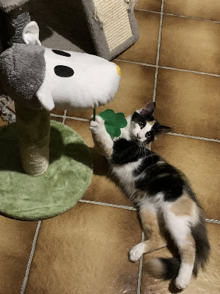 J’adore jouer avec des cartons, des pompons, des vêtements, le lit, des chaussures et voler l’éponge de cuisine (rien ne m’arrête !) ! Je la chipe de jour ou de nuit ! J’adore aussi jouer avec la canne à pêche avec l’humain mais attention !: pas de contact ou je griffe ! Surtout pour aller chez le véto, il vous faudra mettre une armure pour m’attraper.