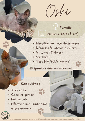 Oshi est une gentille minette de 8 ans qui cherche un nouveau foyer où elle aura toute l'attention qu'elle souhaite.