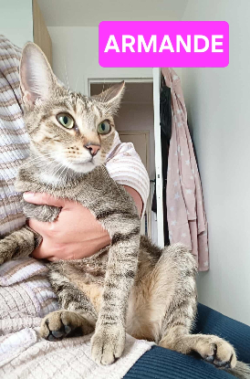 Armande est une jeune chatte tigré qui vient de la rue. C'est une minette incroyablement douce et gentille qui aime vraiment l'humain petit comme grand, très facile à vivre. Elle aime dormir sur un lit douillet et surtout se mettre au chaud sous les couvertures. Elle a vite pris ses marques et est très propre. Il lui faudra un extérieur : balcon terrasse sécurisée ou jardin clôturé. Elle n'attend plus qu'un foyer chaleureux pour vous combler d'amour.