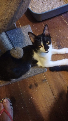 Aujourd’hui, c’est un chaton très câlin, paisible et attachant : il aime se poser sur vous, miaule pour attirer votre attention et tend sa patte sur votre joue pour que vous le regardiez . En confiance, il se laisse faire et profite pleinement de chaque moment de tendresse.