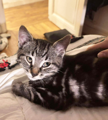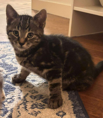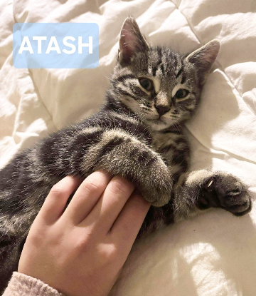 Atash petit chaton dont le prénom signifie feu en persan, porte bien son nom ! C’est un petit chaton plein d’énergie, curieux et très joueur. Le premier de la portée à venir chercher des câlins, il adore explorer le monde qui l’entoure à son propre rythme.