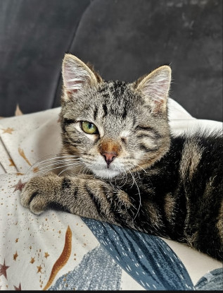 Il a été trouvé errant, tout seul avec un gros coryza qui malheureusement a necessité une énucléation en urgence lors de se prise en charge.