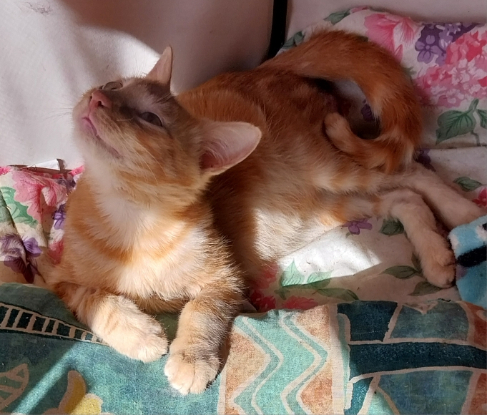 chaton de 5 mois bientôt avec un handicap a l'oeil et sa tête dut au typhus. la bonne nouvelle c 'est que cette maladie est derrière lui.