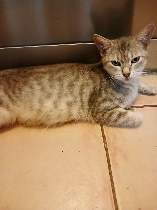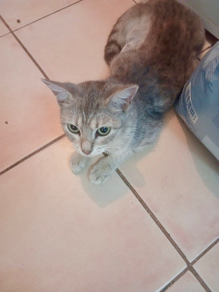 ELINOR , femelle au magnifique pelage gris rayé noir, a été sortie de la fourrière de Guadeloupe in extremis.
