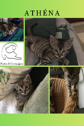 Athéna est née le 25/09/25. Récupérée à l’âge de 3 semaines, elle s’est épanouie dans sa famille d’accueil et cherche à présent sa famille pour la vie. Adoption uniquement en intérieur, avec des copains chats pour finir son apprentissage des codes. Pas de sortie extérieure. C’est une petite minette au caractère bien trempée, elle sait ce qu’elle veut ! Assez dynamique, gourmande et câline. Participation aux frais vétérinaires de 100€.