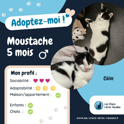 Moustache tient son prénom de sa petite tâche noir à côté du nez, ce qui le rend adorable ! En plus d’être très mignon, Moustache est un chat très attachant, câlin et proche de son humaine. Il peut se montrer un peu timide avec les personnes qu’il ne connait pas. Mais il offre très vite sa confiance, et vous promet une relation très fusionnelle. Avec Moustache dans les parages il sera impossible de faire une sieste sans lui ! Aussi, il vous accueillera dès que vous rentrerez à la maison. Moustache est aussi joueur, et a tout d’un petit bout de chou craquant !