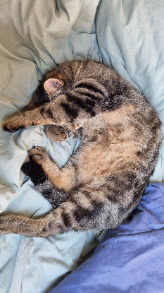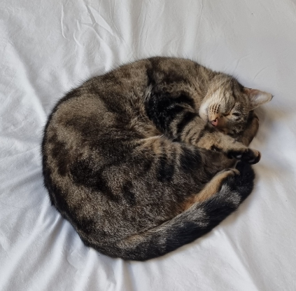 Auprès de mes humain•es, j’aime me prélasser et roupiller à leurs côté en recevant des caresses, ça me permet de me recharger pour ma prochaine mission du soir.