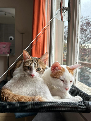 Ensemble, ils se suivent partout et se partagent tout ! Kit est un vrai pot de colle, câlin et joueur. Kat est plus discrète et met un peu plus de temps à accorder sa confiance.