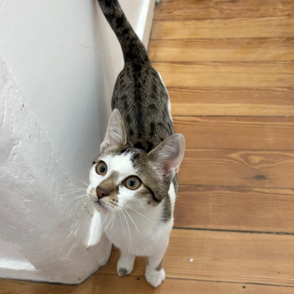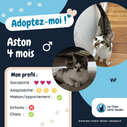 Aston est un petit chat plein d’énergie, encore un peu timide, mais d’une grande douceur. Il adore les caresses… quand il en décide lui-même ! Très gourmand, toujours prêt pour une friandise, il se montre incroyablement gentil. Il passe beaucoup de temps à jouer avec ses humains , surtout lorsqu’il y a des jouets à plumes, ses favoris. Malgré son côté vif, il sait aussi être d’un calme exemplaire et raffole des longues siestes sur le canapé. Un véritable petit amour !