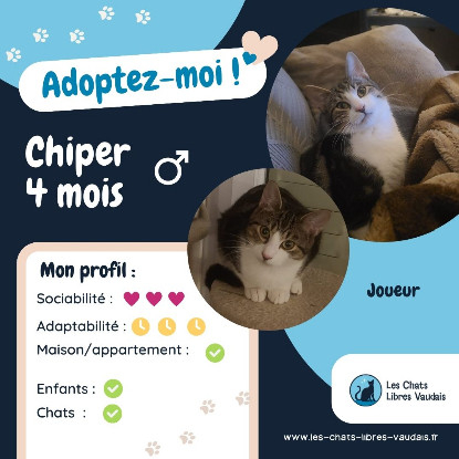 Chiper porte un prénom de petit filou. Car oui, c’est un petit filou vraiment trop craquant ! Chiper est bien dans ses pattounes, c’est un chaton qui sait ce qu’il veut, et n’est absolument pas timide. Au contraire, il est très curieux, et sera sans cesse dans vos pattes pour participer à vos activités quotidiennes. Chiper de chipe pas de la nourriture, rassurez-vous, c’est simplement un petit rigolo toujours partant pour mettre de la bonne humeur à la maison !