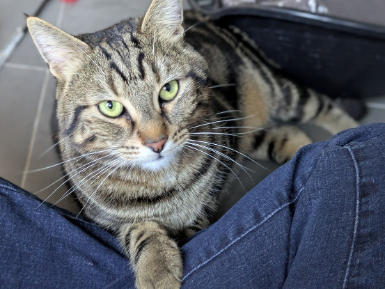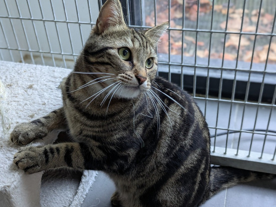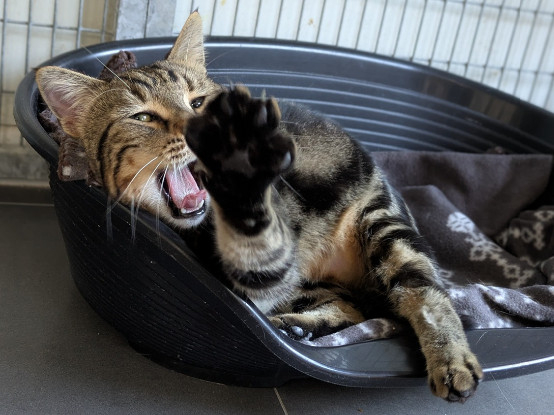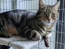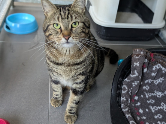 Hyper gentil, ce jeune et grand matou né en août 2023 est en grande demande de tendresse et de caresses. Dès qu’on va le voir dans sa cage, il se montre plein d’enthousiasme pour venir chercher des câlins et des grattouilles. Il aime aussi jouer de temps en temps. Il vivait en appartement avec un autre chat et est également habitué aux enfants.