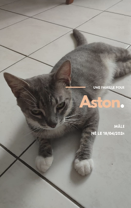 Aston est un magnifique chat au pelage gris, et surtout un véritable Monsieur Ronron très proche de l’humain. Il est affectueux et en recherche constante de contact et de câlins. Il est très calme, gourmand, il aime jouer.