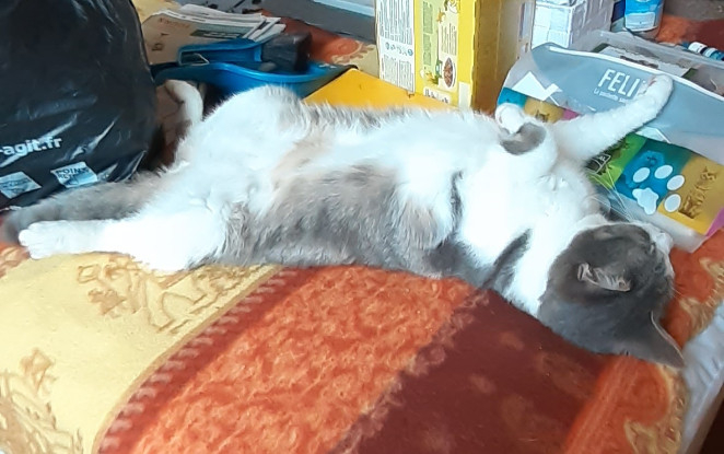 Gros matou paisible de 8ans dont sa maîtresse a du se séparer suite à un déménagement dans une colocation, Miel est sociable et recherche la compagnie des humains mais a mal avec certains de ses congénères.