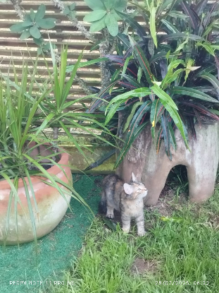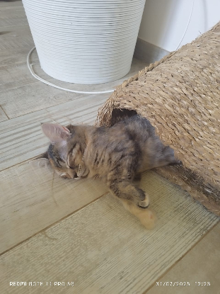 Son anniversaire est le 08/04/2025. Ambre, petite minette tricolore à poils longs, a été déposée avec sa soeur Melly devant la porte de l'association le 26 Juin 2025. Affamées, parasitées et très craintives... Séparées trop tôt de leur maman, elles peuvent essayer de téter.