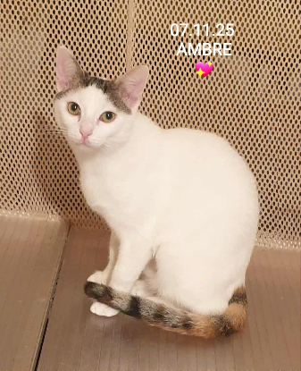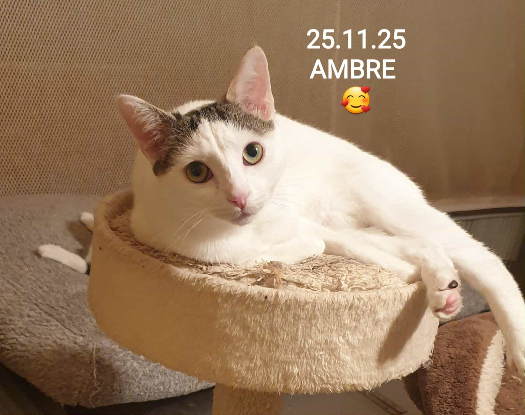 Comportement : AMBRE est une super minette câline, elle reste timide à l'approche lorsqu'elle ne connait pas, une fois en confiance elle demande plein de câlins. Très sociable, elle cohabite parfaitement avec des chatons de tous âges sans aucune appréhension. Son jouet préféré le plumeau et là, elle oublie le reste de sa timidité.Elle est très joyeuse. Si la personne est patiente et compréhensive, qui sera lui laisser le temps de se poser, elle sera vraiment une minette adorable.