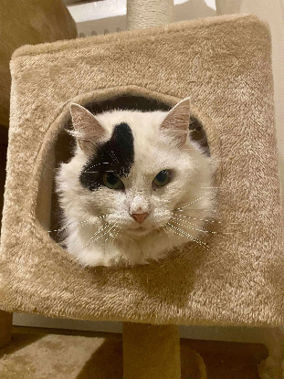 Ebly est un beau matou, poils mi-longs, blanc avec un peu de noir, pas trop mais assez pour donner un effet de style. Minou est très posé et il sait la vie après ses peines.