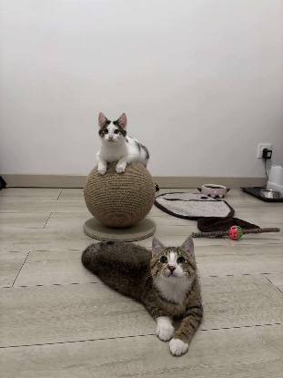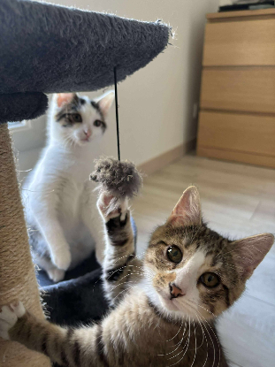 Archie est gris et blanc, Aslo trigré et blanc. Ce sont deux frères qui se complètent à merveille.