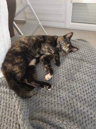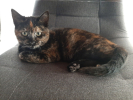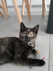 Moi, c’est VIBRISSE. Je suis une petite chatte d’environ 4 mois, au beau pelage « écaille de tortue ».