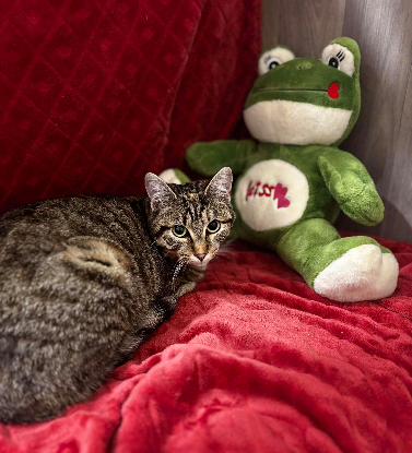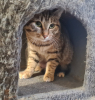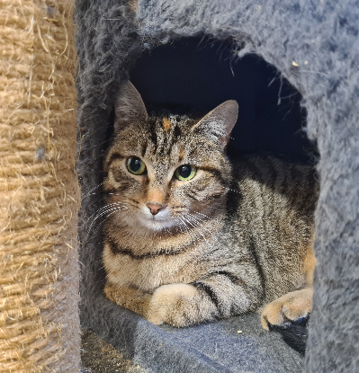 C'est une petite minette toute douce et timide. Elle aime bien se blottir dans la niche de l'arbre à chats où elle se sent en sécurité.