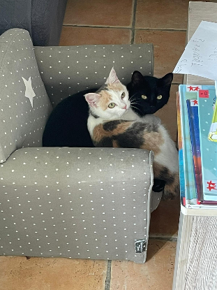 Belle et Rebelle sont 2 chats Femelle, de type Européen, identifiées, vaccinées, stérilisées, de couleur Tricolore diluée pour Belle et Noir pour Rebelle.