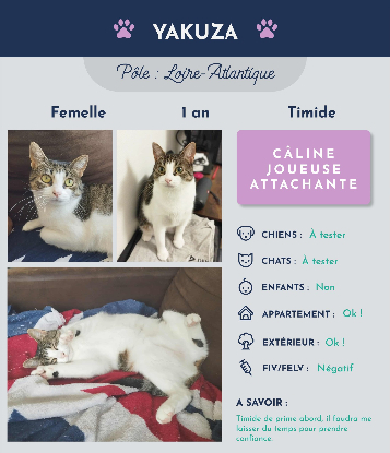 Je suis une jeune minette qui n'aime pas les gestes brusques et qui a besoin de temps pour accorder sa confiance. Mais une fois que je vous la donnerai, je serai un vrai petit pot de colle !