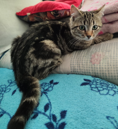 Abeille est arrivée en pleine forme dans sa famille ; en pleine forme mais craintive voire un brin sauvage. Et il en était de même pour son frère et sa sœur. Pas facile de grandir dans la rue sans aucun contact avec l'homme et un jour se retrouver en 40aine, certes bien au chaud et en sécurité avec une belle gamelle de croquettes et pâtée à volonté, et avec une humaine qui veut nous papouiller. On est mieux entre chats nous. Alors il a fallu la séparer de sa fratrie et le changement de famille d'accueil lui a permis le déclic. Abeille s'est rapprochée de l'homme le jour même. Elle avait besoin de réconfort même s'il y avait des chatons et chats pour lui tenir compagnie. Abeille est une minette indépendante mais qui apprécie désormais les câlins. Elle est joueuse et quand on s'approche d'elle, il faut y aller en douceur car elle reste encore timide. Mais elle progresse de jour en jour si on lui laisse du temps. Elle sait accorder sa confiance une fois rassurée. Elle aime dormir auprès de sa famille la nuit.