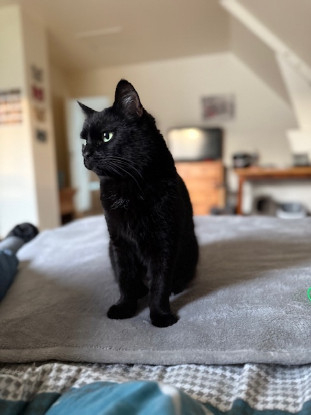 Flow est une jeune minette d’environ 3 ans, au pelage noir et épais et au petit gabarit, aussi élégante qu’adorable.