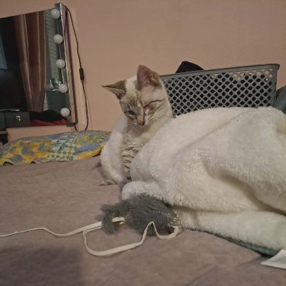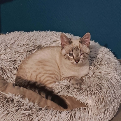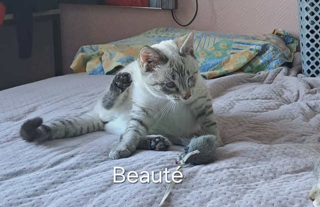 Beauté est une adorable jeune chatte pleine de douceur et de malice. Elle sera malheureusement malvoyante : un œil restera fermé et l’autre présente un voile. Cet œil est actuellement en soins et suivi avec attention.