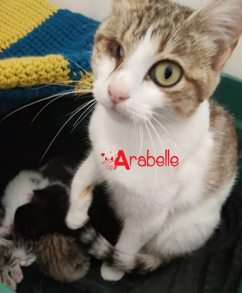 Déposée dans une caisse avec ses 5 chatons devant une clinique vétérinaire, Arabelle a rapidement été prise en charge par MOUSTACHAT et accueillie par une de nos bénévoles. Arabelle a pu élever ses chatons dans un environnement aimant en toute sécurité.