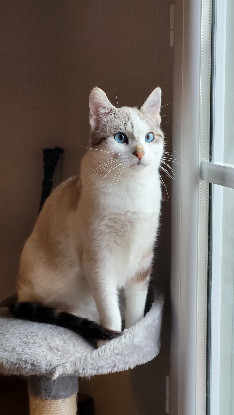 C'est un chat qui est très curieux, joueur et gourmand mais qui se laisse caresser avec douceur uniquement au moment de la pâtée du soir. Il se soigne et commence à se laisser faire mais il reste un temps de sociabilisation sur la caresse.