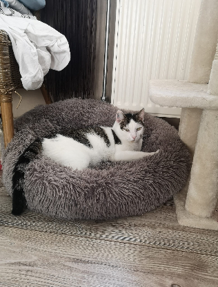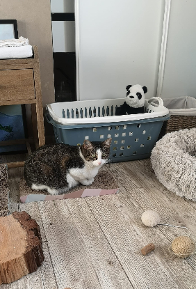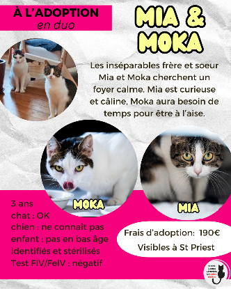 Après être sortis de la rue où ils ont grandi à côté des humains, Mia et Moka se révèlent très gentils. Mia est maintenant à l’aise avec sa FA, curieuse et adore les câlins. Moka encore timide mais il commence à se laisser caresser.