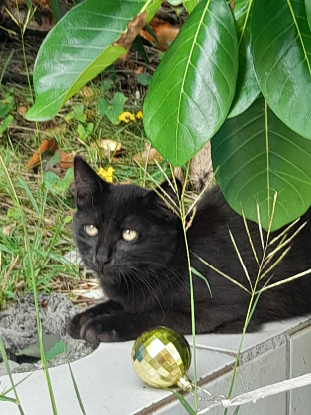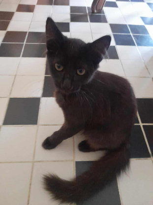 Cola est une petite femelle noire née le 30/08/2025, sociable, câline et très joueuse.
