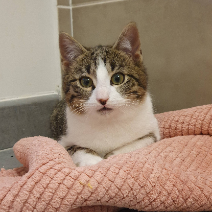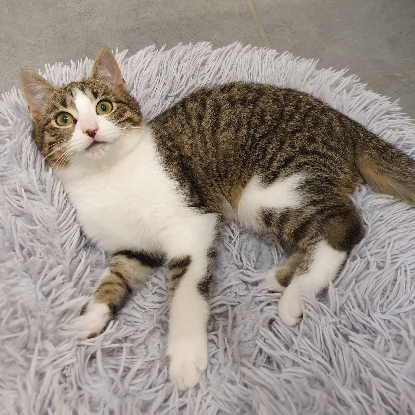 Derrière sa réserve se cache un chaton en demande de câlins : une fois en confiance, il apprécie les moments de tendresse et sait se faire comprendre en miaulant pour qu’on s’intéresse à lui.