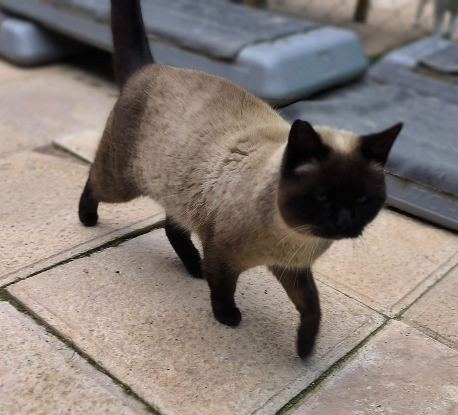 Elle est arrivée très maigre, boitant d'une patte arrière. Elle va beaucoup mieux aujourd'hui et ne boîte qu'à de très rare occasion et très légèrement.