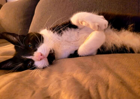 Mon histoire : un jour, je suis apparu à une porte et je voulais entrer. Une famille bienveillante m'a nourri et cherché les propriétaires, en vain. Puis le froid est venu et là, il m'ont recueilli au sein du foyer.