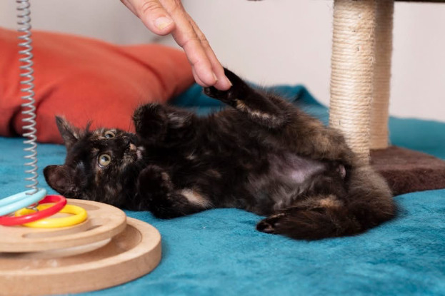 J’adore les caresses et je me couche sur le côté pour les papouilles sous le ventre. J’aime aussi me faire prendre dans les bras pour les câlins et je joue beaucoup avec mes balles ?.