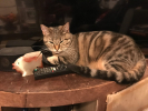 Athena est une petite minette très joueuse, qui se satisfait de tout ! (Porte de la salle de bain, crayon… elle est même déjà tombée dans les toilettes !) il arrive qu’elle se balade dans la maison avec ses jeux de plumeaux.