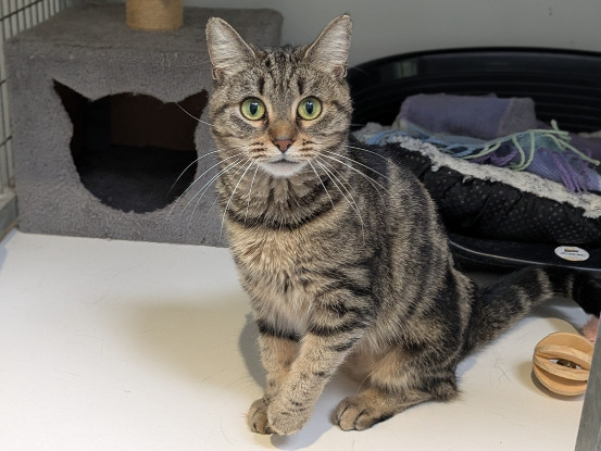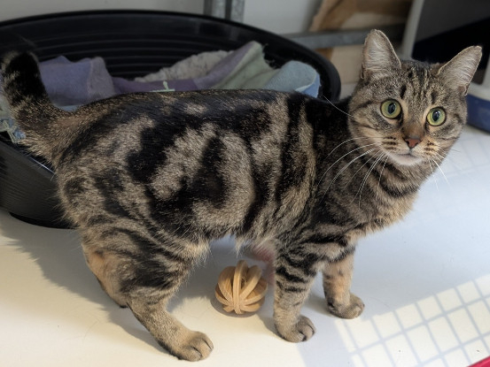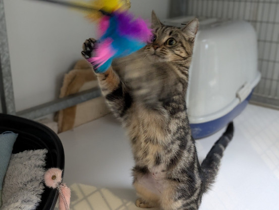 Cette jolie demoiselle née fin décembre 2024 vient d’elle-même chercher quelques caresses dès qu’on vient lui parler gentiment, en répondant parfois par de petits miaulements. D’un tempérament joueur, elle découvre le plumeau et cela l’intéresse beaucoup ! Elle apprécie aussi quelques petites friandises de temps en temps.