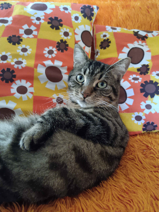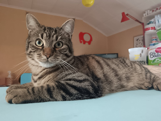 - Miaaa ! Je passe beaucoup de temps à la fenêtre, j’observe les chat•tes du quartier ! J’aimerais bien les rejoindre et faire la fiesta avec elleux ! Et, je n’aime pas la routine, il faut qu’il se passe pleins de choses autour de moi ! J’aime pas quand c’est trop calme, miouu !! Et je joue beaucoup ! Je suis très curieux !