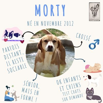 SON CARACTERE : Morty est un chien un peu solitaire, mais il est sociable avec les autres chiens et s'entend aussi bien avec les humains. Si une famille voulait l’adopter avec Ricky, ce serait l’idéal pour eux car ils ont toujours vécu ensemble, mais si cette opportunité ne leur étant pas offerte, ils seront séparés afin de leur donner plus de chance de trouver une famille.