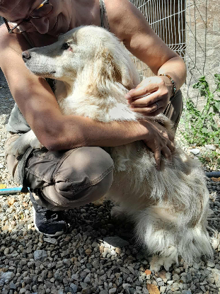 Son histoire : Le 18 juin 2021, Maria, Ferenc et Claudine ont sauvé Alba et une dizaine de chiens chez un éleveur qui pratiquait la reproduction intensive. Il vendait certains chiots, en élevait d'autres au combat et laissait mourir de faim les adultes qui ne pouvaient plus se reproduire. Les chiens vivaient dans des conditions déplorables. Alba est depuis au refuge des Innocents mais malheureusement, personne ne pose un regard sur elle