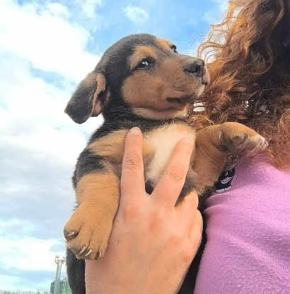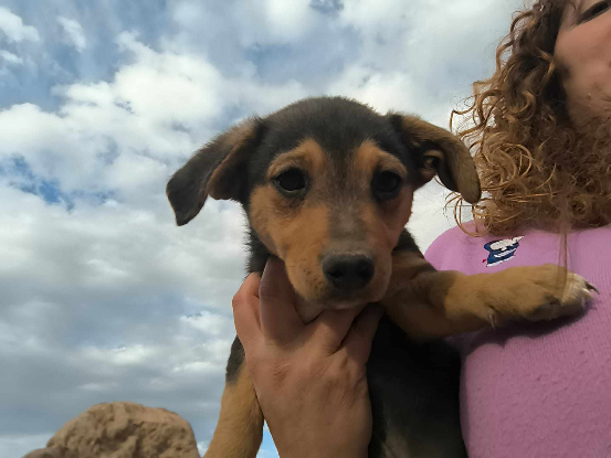 Naxo est un petit chien curieux et sociable, un comportement typique de chiot qui aura tout à apprendre dans sa nouvelle famille.