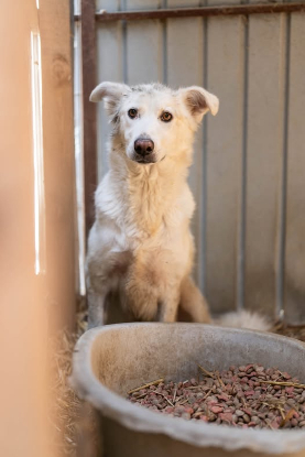 Leika est une belle chienne qui se montre douce. Elle est timide avec les humains. S’il on la laisse faire sa vie, dans son box, d’elle même elle va les éviter et ne pas aller les voir. Si l’humain vient à son contact, elle en a peur. Mais une fois qu’elle est caressée par Elena, elle se détend et devient curieuse avec la nourriture.