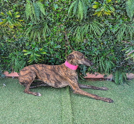 SON CARACTERE : C'est une galga très douce et timide, qui a besoin de temps pour s’adapter aux changements. Elle n’est pas complètement paniquée ou terrifiée, mais si elle ne se sent pas en confiance avec la personne qui s’approche d’elle, elle court se coucher dans son panier et reste immobile jusqu’à ce que cette personne s’en aille. Elle est très calme et gentille, s’entend très bien avec les autres chiens, elle suit les autres, peu importe si elle est avec des chiens plus actifs qu’elle qui l’embêtent pendant qu’ils jouent, elle reste toujours très douce et soumise. Convient aux familles expérimentées avec des lévriers craintifs et ayant déjà un autre chien à la maison.